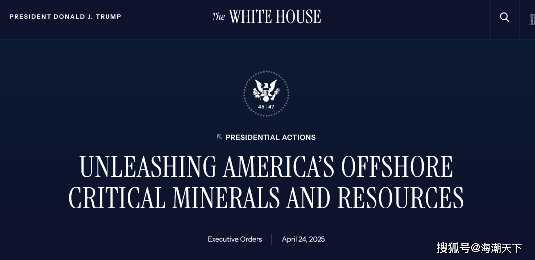 ▲上图:2025年4月24日,美国白宫发布了一项旨在释放美国近海关键矿产潜力的行政命令。这份由总统签署的文件明确指出,确保关键矿产供应链的自主性已成为美国国家安全与经济利益的核心。该命令声称,“目前美国面临着在不依赖对手国家控制的情况下获取稳定资源供应的严峻挑战”,而广阔的海底区域被视为解决这一困境的关键突破口。根据该指令,美国将利用其控制的全球最大海洋面积之一,加速开发深海多金属结核以及其他海底地质构造中的资源。行政命令强调,美国必须立即行动,量化海底矿产的禀赋,并重新确立美国“在深海开采及加工技术领域的领导地位”。图源:白宫