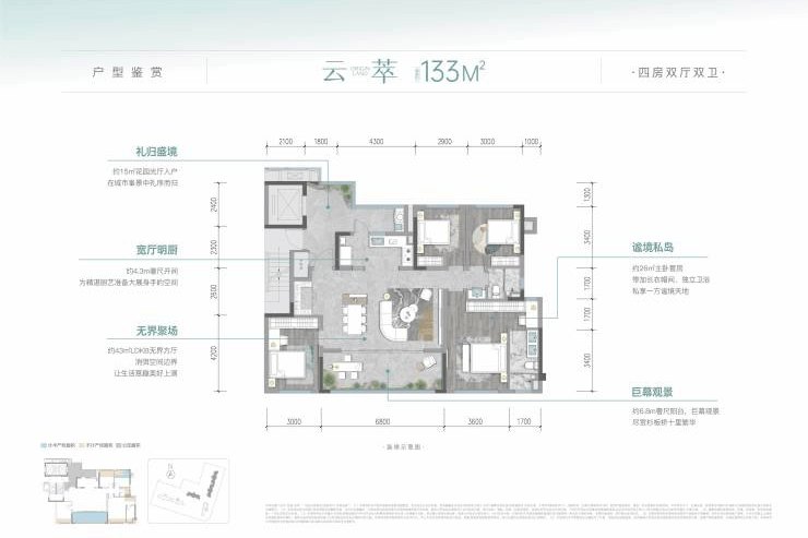 - **超奢空间**:建面约112㎡的户型可享超配4房大方厅,采用LDKB一体化设计,消除了空间界限,打造出生活丰盈的场景,书房空间巧妙打通,双阳台对望,让室内更加通透;建面约133㎡的户型则拥有4房大双厅和奢阔主卧,幻变空间可根据家庭需求改造成书房、棋牌室等,满足家庭全生命周期的各种情景需求。