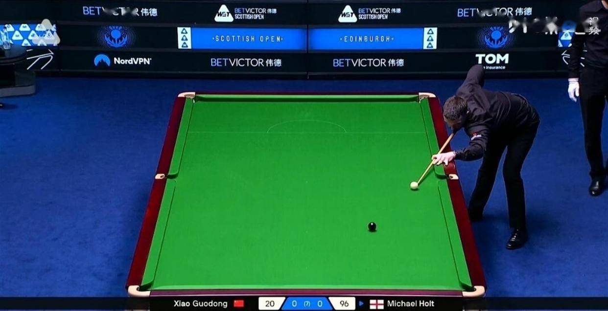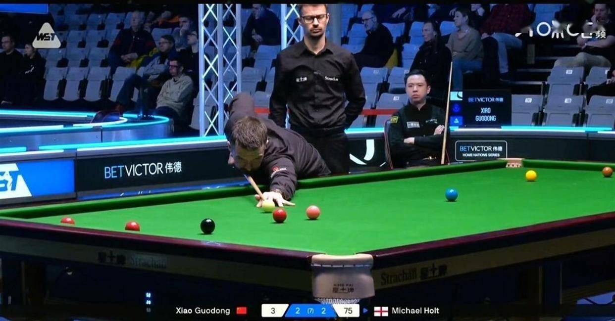 比赛的第一局,肖国栋的防守就出现了失误,漏出机会。霍尔特毫不犹豫,率先上手,一杆拿下57分。虽然他在击打黑球时出现失误,但肖国栋仅得到20分就在一颗简单的粉球上出现致命失误,将机会交还。霍尔特再次上手后,以103分清台,拿下第一局。