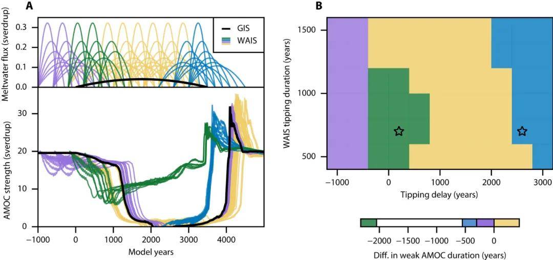 所以,大西洋经向翻转环流(AMOC)的研究非常多,然而在这一项研究之中,发现了南极冰川融化之下的侧面效应,那就是有时间可以减缓大西洋经向翻转环流(AMOC)的转变过程。