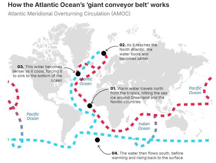 如果全球变暖发展下去,那最终就可能出现崩塌,因为它为北半球带来了足够的温暖,使那里的气温相对温和,如果AMOC减慢或崩溃,欧洲和美国的大部分地区可能会陷入深度冷冻,进入极寒,在未来气候的连锁效应之下,就有概率带动全球进入小冰河时期。