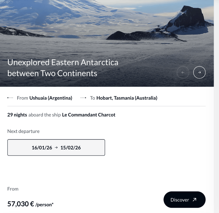 目前,官网显示,庞洛邮轮提供的南极航线时长多为10-20晚,价格普遍在1.2万欧元到2万欧元/人,其运营的“指挥官夏古号”定价显著高于其他航线。“指挥官夏古号”29晚南极航线起订价为5.703万欧元/人(约合人民币46.9万元),最高级套房定价15.673万欧元/人(约合人民币123.5万元);14晚的航线起订价,高达2.2万欧元/人(约合人民币18.1万元),较同时长其他邮轮航线贵近1万欧元。值得注意的是,其产品价格会随预订率升高而升高。