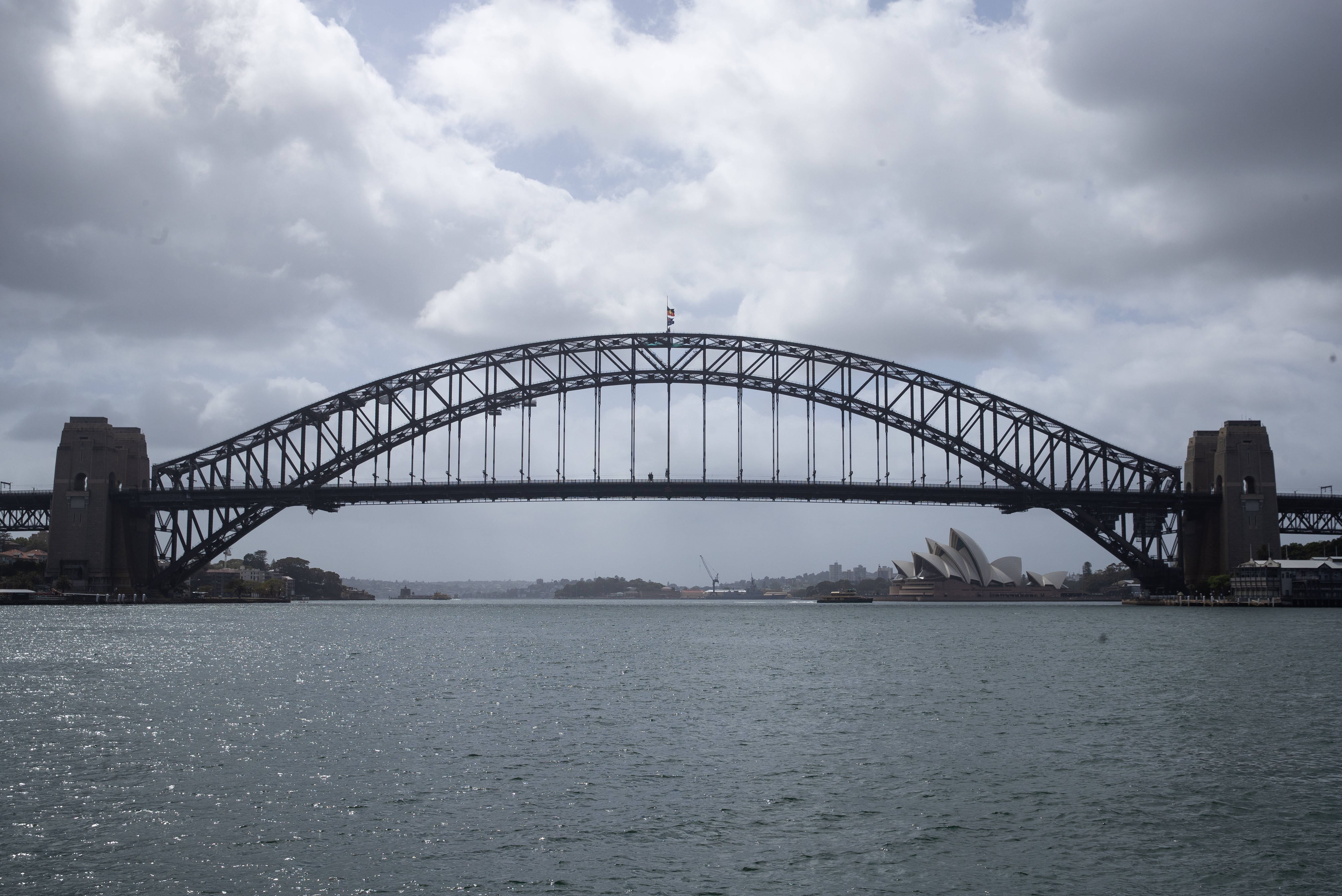12月15日,澳大利亚悉尼的海港大桥降半旗悼念邦迪滩枪击事件遇难者。 新华社记者 马平 摄