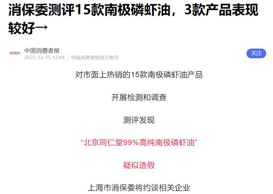 据公开信息,2025年12月11日,上海市消费者保护协会(简称“上海消保委”)发布消息称,委托中国水产科学研究院东海水产研究所对市面上15款南极磷虾油产品进行检测,检测重点关注磷脂、虾青素、EPA(二十碳五烯酸)、DHA(二十二碳六烯酸)含量和价格等。