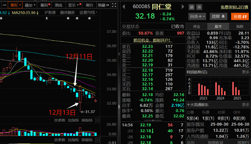 截至2025年12月23日收盘,同仁堂总市值434.8亿元,收盘下跌1.49%。而在此前的12月11日该公司股价已经出现下跌迹象。12月13日盘中剧烈震荡,当日振幅达到5.83%,盘中似有资金护盘,放量明显。随着事件发酵,其股价弱势明显。