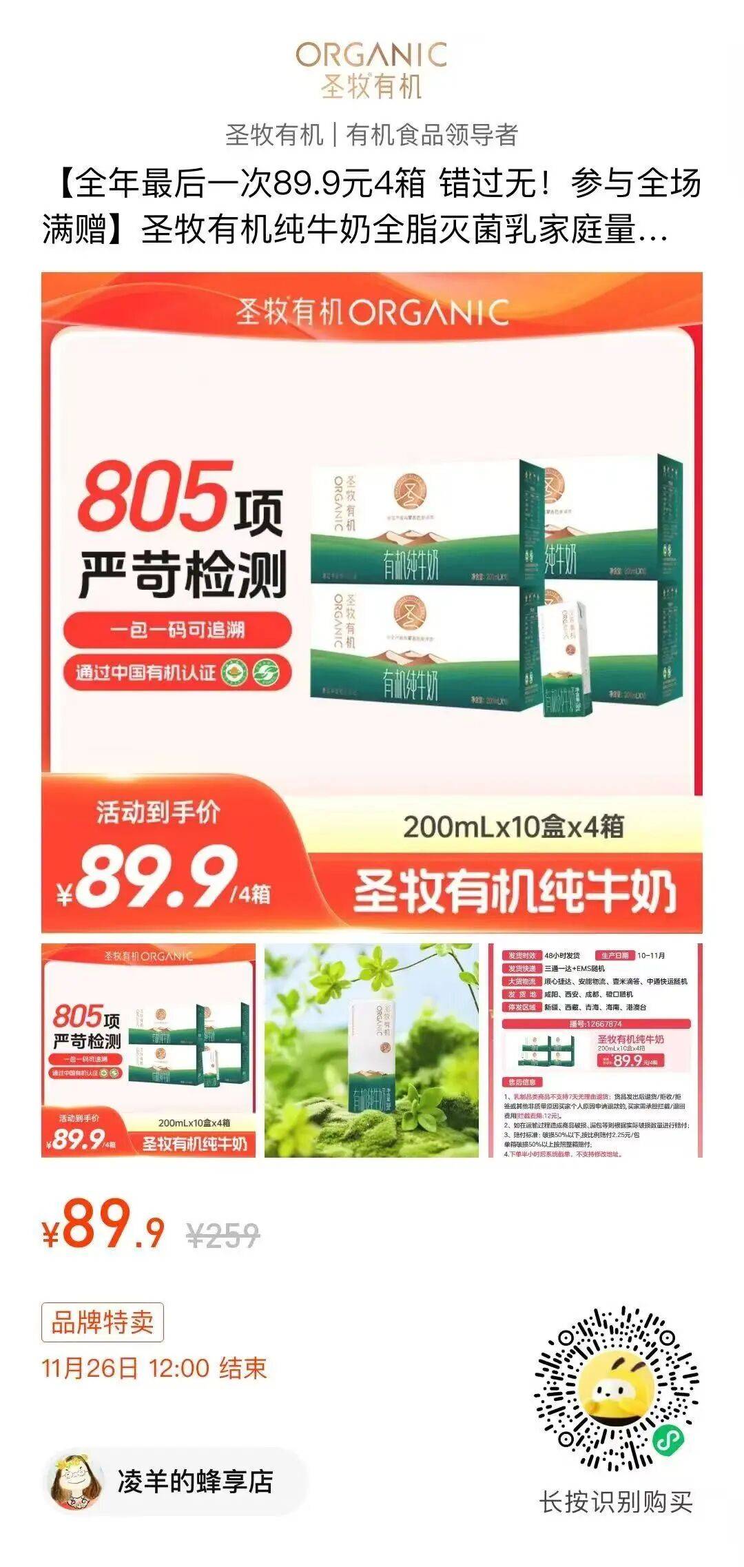圣牧有机牛奶,89元四箱的活动,应该是全年最后一次了。