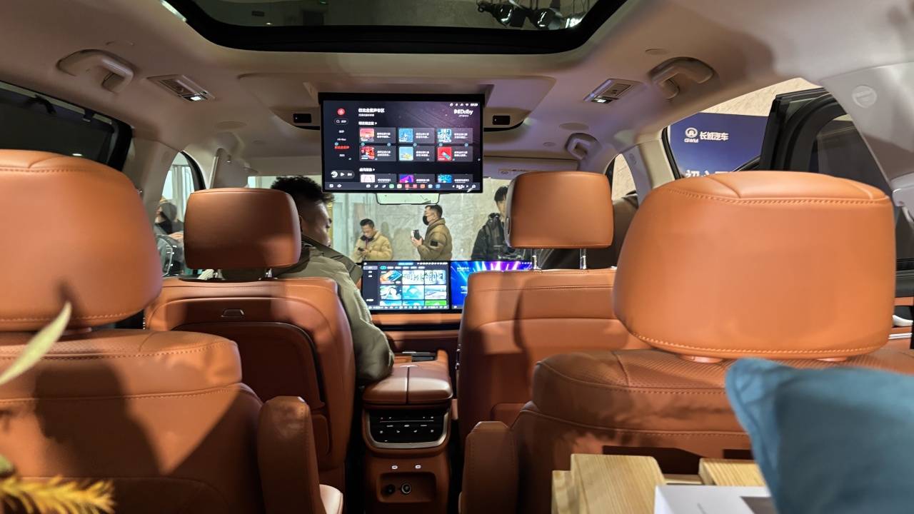 车内配置也没有掉队,冰箱、彩电、大沙发、后备箱220V接口一应俱全,可以说9系能给的它也能给。前排屏幕可以同步控制后排吸顶屏的设计值得肯定,不过也有可以提升的地方,比如冰箱只支持上方双开门,如果可以加侧面开门方式,后排乘客使用起来会更方便。