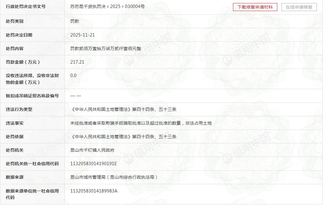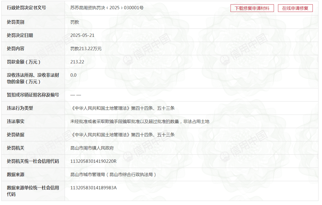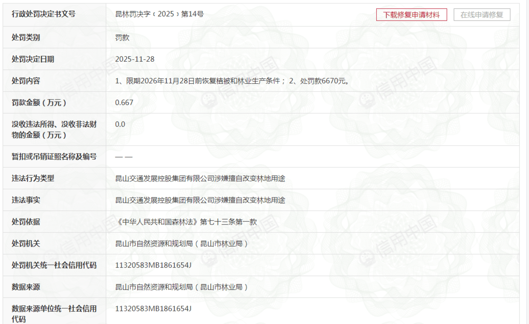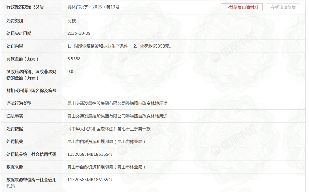 值得注意的是,2025年5月21日,昆山交通发展控股集团有限公司曾因相同的原因被罚213.22万元。除此之外,今年该公司还因涉嫌擅自改变林地用途被处罚2次。