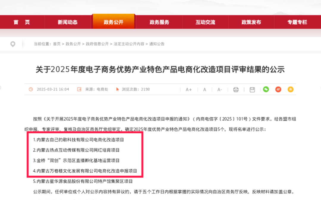 我市网络零售额稳居全区首位,占全区比重超50%。金桥“双创”示范区直播孵化等4个项目获评自治区“2025年优势产业特色产品电商化改造项目”,“内蒙古圣天信息科技线上平台”等3个项目获评自治区“电商平台促进我区商品销售项目”。