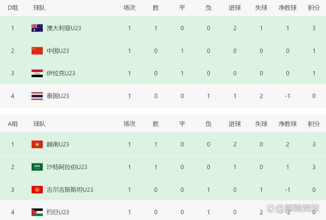 北京时间1月8日,U23亚洲杯D组首轮较量全面展开。 中国队在沙特与伊拉克队激战90分钟,最终以0-0的比分握手言和。 尽管未能取得开门红,但门将李昊在比赛尾声的两次关键扑救力保球门不失,为中国队抢下宝贵1分。 同组另一场比赛中,澳大利亚队在先失一球的情况下,凭借两分钟内连入两球逆转泰国队,暂居小组头名。