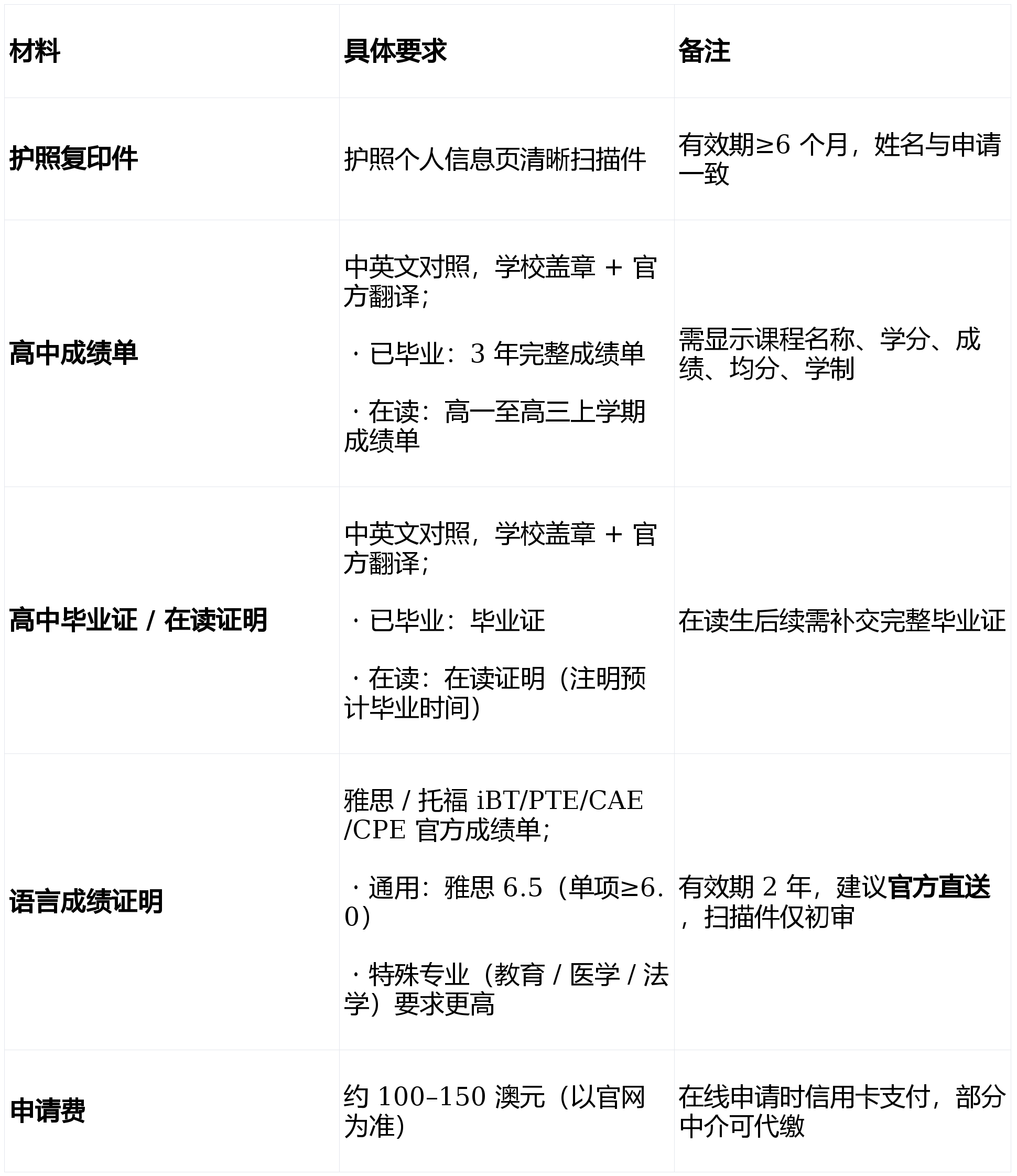 核心结论:必备材料 = 护照 + 学术证明(成绩单 / 毕业证 / 在读证明)+ 语言成绩;特殊专业额外要 PS / 推荐信 / 作品集 / 面试 / 入学考试;所有非英文材料需官方英文翻译 + 认证,建议提前 3–6 个月备齐。