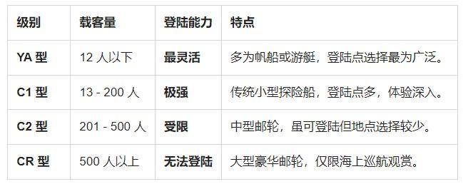 IAATO 将运营南极旅游线路的游轮分为四种级别,分别是:
