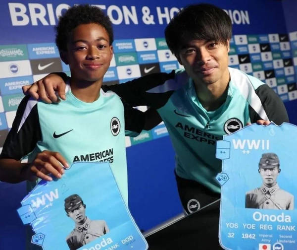 此前,布莱顿队青训学院发布的一则帖子中,有日本国脚三笘薰与一名青年球员的合影,二人手持印有二战期间日本军人小野田宽郎照片的卡片。