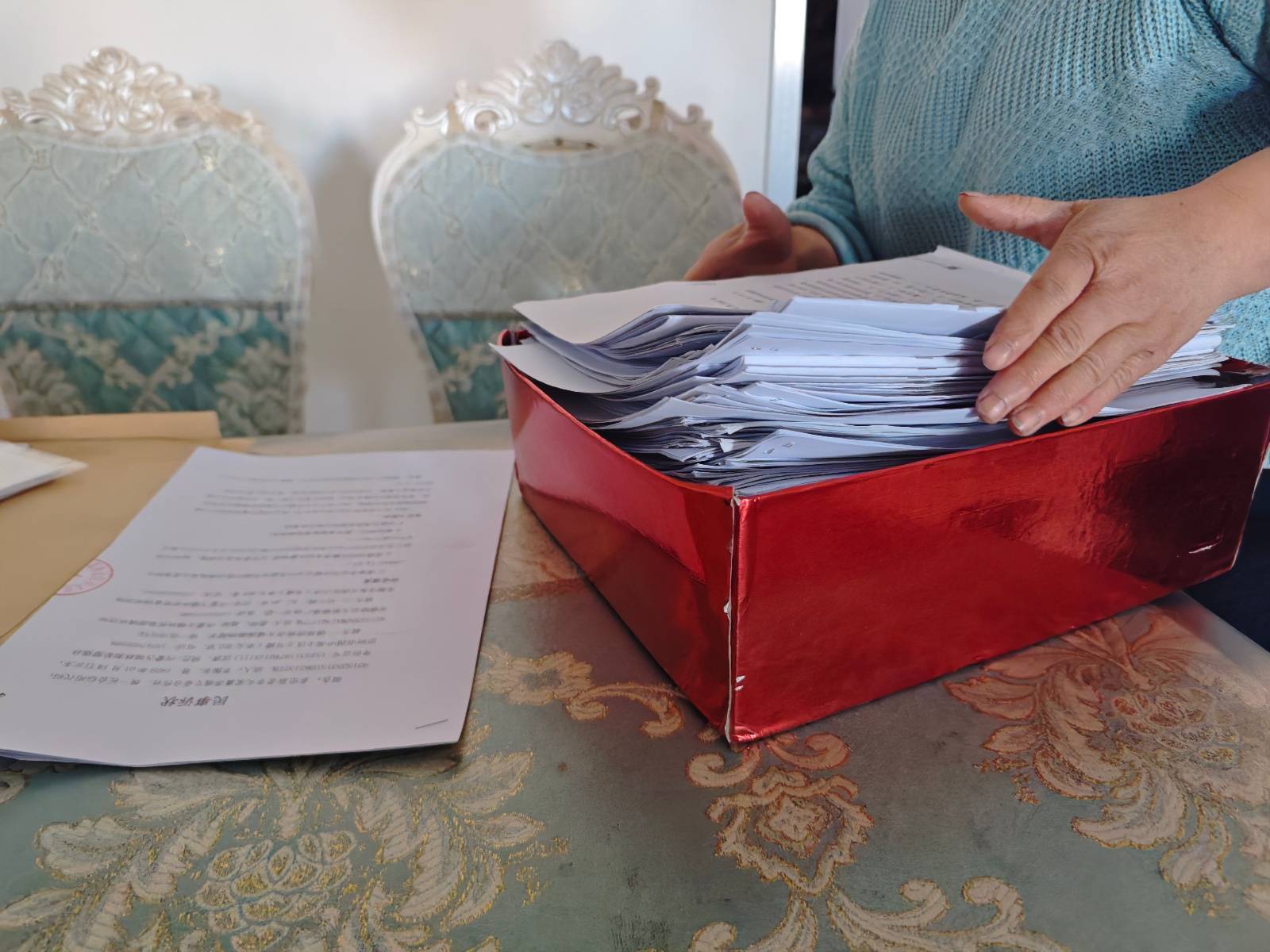赵小娴把拿到的判决书都放进一个纸盒子里存放,共32起诉讼,历时5年,近70份判决书,叠起来高22.5厘米。诉讼材料则放满了一个书架、三个抽屉、三个22L容量的收纳箱外加一个45L容量的收纳箱。