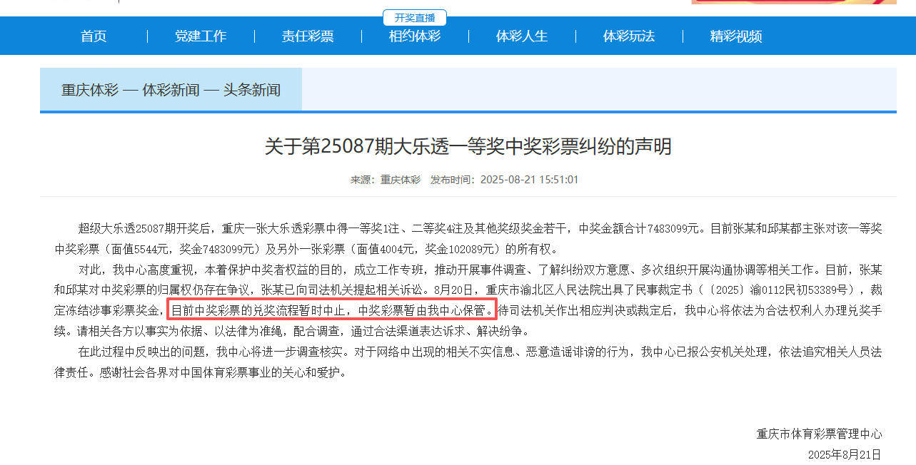 对此,该中心高度重视,本着保护中奖者权益的目的,成立工作专班,推动开展事件调查、了解纠纷双方意愿、多次组织开展沟通协调等相关工作。目前,张某和邱某对中奖彩票的归属权仍存在争议,张某已向司法机关提起相关诉讼。8月20日,重庆市渝北区人民法院出具了民事裁定书,裁定冻结涉事彩票奖金,目前中奖彩票的兑奖流程暂时中止,中奖彩票暂由该中心保管。待司法机关作出相应判决或裁定后,我中心将依法为合法权利人办理兑奖手续。请相关各方以事实为依据、以法律为准绳,配合调查,通过合法渠道表达诉求、解决纷争。