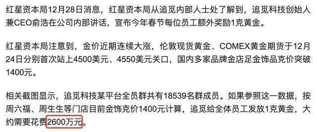 瑞财经 吴文婷12月28日,据媒体报道,追觅科技创始人兼CEO俞浩在公司内部讲话,宣布今年春节每位员工额外奖励1克黄金。